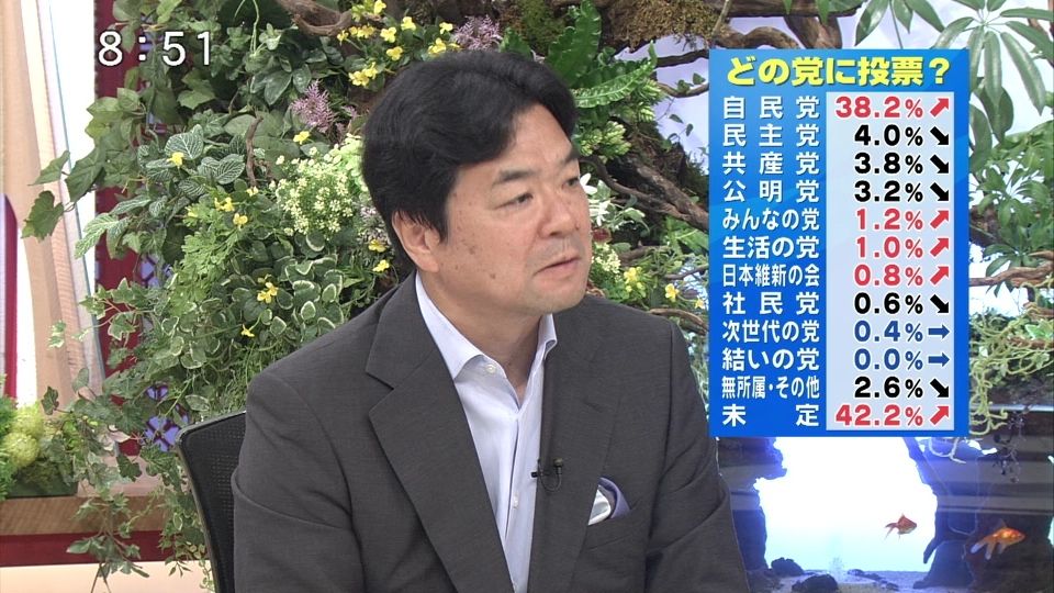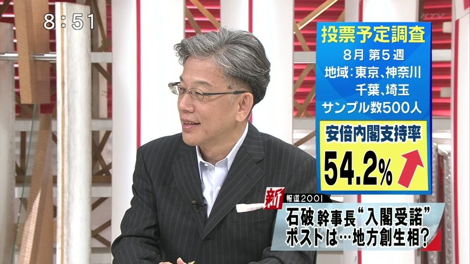 引用元: ・【調査/新報道2001】安倍内閣支持54.2% 次回選挙投票先 自民38.2% 民主4.0% 共産3.8% 公明3.2% みんな1.2% 生活1.0%[8/31]