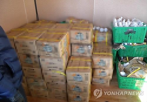 ▲ 摘発された海苔養殖業者の倉庫に積まれた農薬。