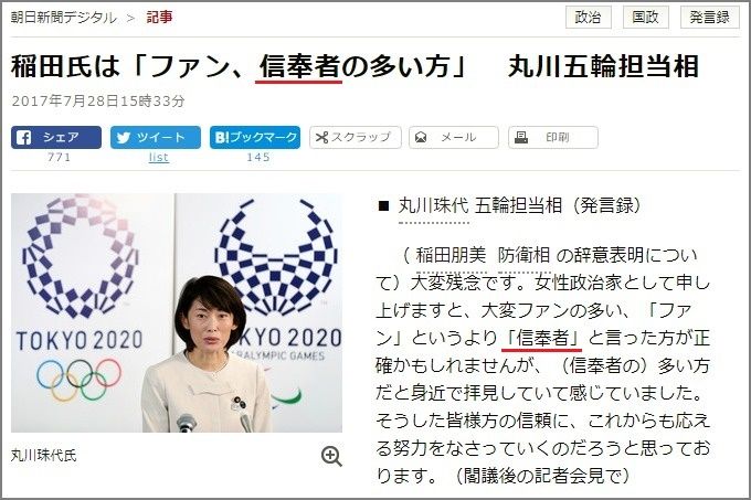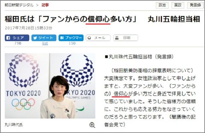 朝日新聞は、稲田大臣辞任に関する丸川大臣の発言として「大変残念です。女性政治家として申し上げますと、大変ファンが多い、(ファンからの)信仰心が多い方だと身近で拝見していて感じていました。」と報じたが、実際には「信仰心が多い方」とは発言しておらず「ファンと言うより信奉者」と、女性閣僚に対するファンと言う言葉が適切ではないという意味で信奉者と言い換えている。そもそも「信仰心」などと聞き間違えるような、宗教めいた話の流れでは無かった。おそらく神道にネガティブな印象を持つ記者が、稲田支持者を神道と結び付ける印象操作をしたものと思われる。
