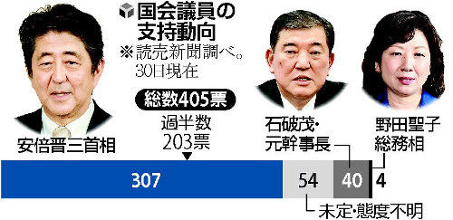 読売新聞社は、9月7日告示、同20日投開票の自民党総裁選で、投票権を持つ同党所属国会議員(405人)の支持動向を調査した。連続3選を目指す安倍晋三首相(63)を支持する議員は307人で全体の約4分の3を占め、石破茂・元幹事長(61)の40人を大きく引き離して優勢を保っている。野田聖子総務相(57)は4人にとどまった。