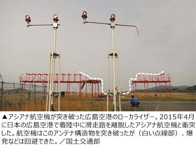 29日に務安国際空港で起こった済州航空着陸事故の原因の一つとしてローカライザー(着陸誘導施設)が強固なコンクリート構造物上に設置されていた点が指摘されているが、これを受け2015年4月に日本の広島空港で起こったアシアナ航空機の不時着事故が改めて注目を集めている。いずれの事故も航空機が滑走路を離脱しローカライザーと衝突した。ただし広島空港の事故でも着陸時の航空機のスピードは時速200キロと非常に速く、衝突後には機体が破損しエンジンが炎上したが、乗客乗員81人のうち27人が軽傷を負っただけで犠牲者は出なかった。