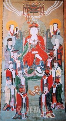 「この朝鮮仏画は元来、慶尚南道通度寺にあったものである。本尊像の2枚の他に聖像と天部守護神像がある。さらに楽器をたずさえた菩薩像もある。描かれた時代は300年前と推定でき、着色が鮮やかで技法に優れ、一見に値いする仏画である」