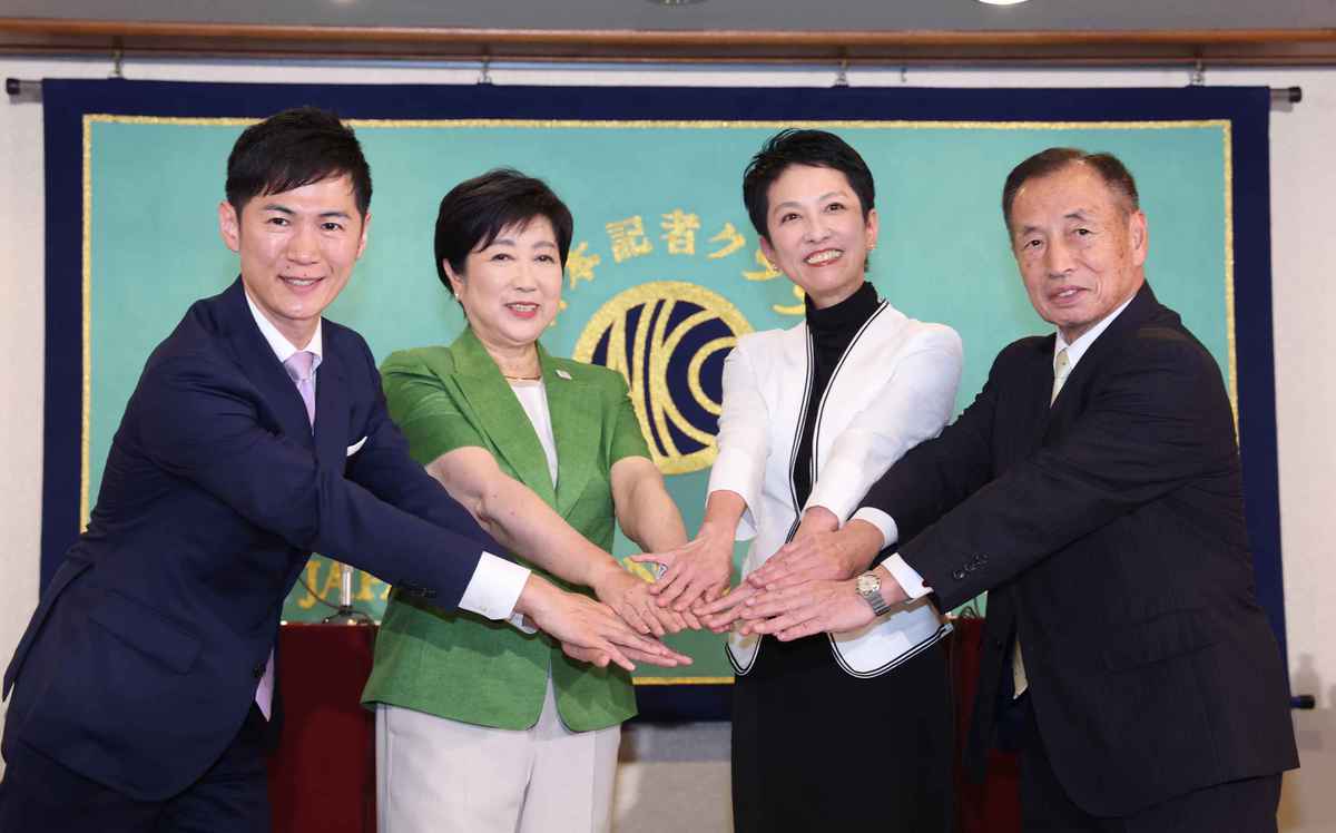 東京都知事選(20日告示、7月7日投開票)に出馬表明した小池百合子知事、参院議員の蓮舫氏=立憲民主党を離党=、広島県安芸高田市前市長の石丸伸二氏、元航空幕僚長の田母神俊雄氏が臨んだ19日の日本記者クラブ主催の記者会見。現在半額の知事給与のあり方、政治資金パーティーの開催、朝鮮人犠牲者追悼式の出席を巡って、小池、田母神両氏と、蓮舫、石丸両氏の間で見解が割れる傾向が明らかとなった。
