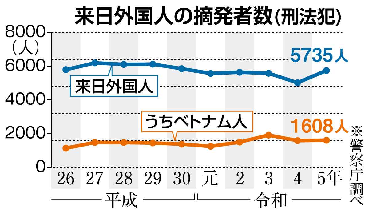 【グラフでみる】年間5千人超、来日外国人の摘発者数の推移