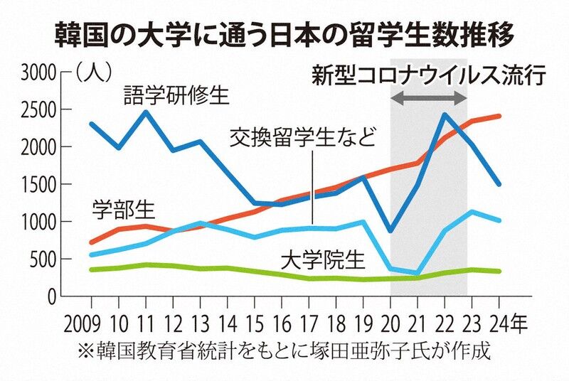 新型コロナ流行前の19年までの10年間は、日本からの留学生は大学院生も含め全体で4000人前後の横ばいで推移していた。00年代半ばから始まった韓流ブームを受けて語学研修生は増え、ピークの11年には2500人近くに達したが、翌年の李明博(イミョンバク)大統領(当時)の竹島上陸を契機にした日韓関係悪化を受け、減少傾向に一変。16年には1200人台にまで落ち込み、じわりと増え続けていた学部生と横並びとなった。そこへ新型コロナ流行に伴う出入国規制が影響し、長期ビザを持ち国外に追い出されない正規学生が短期留学生をしのぐ主流派の座におさまった。