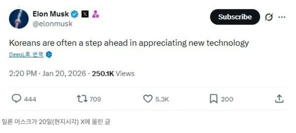 マスク氏は20日(現地時間)、自身のXのアカウントに「韓国人は新しい技術を受け入れることでしばしば一歩先を行っている」(Koreans are often a step ahead in appreciating new technology)と書き込んだ。これについて自動車業界では、昨年世界市場でテスラの販売が低迷し、経営実績が悪化した中で、韓国市場の実績だけが「唯一成長」したことを肯定的に評価したという分析が出ている。