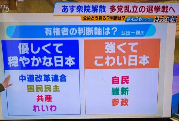 はい(とフリップを示す)。優しくて穏やかな、中道、国民民主、共産、れいわ。強くてこわいと思われる日本は、自民、維新、参政が