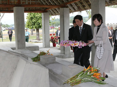 安倍首相は、昭恵夫人と共に戦没者慰霊碑の前で黙とうした後、現地で戦没者の遺骨収集と